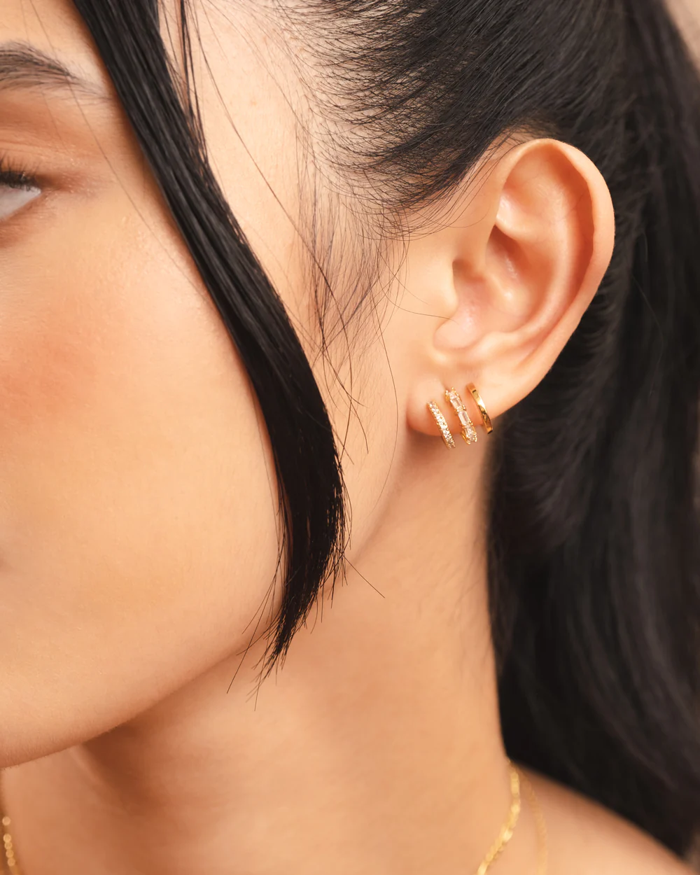Take your ear game to its peak with a polished triple stack brought to you by this illusion design. Starring cubic zirconia cut and set in two different styles, plus a sleek gold huggie for maximum impact, expect this pair to turn heads. Do it all with just one piercing with the Amara Huggies.