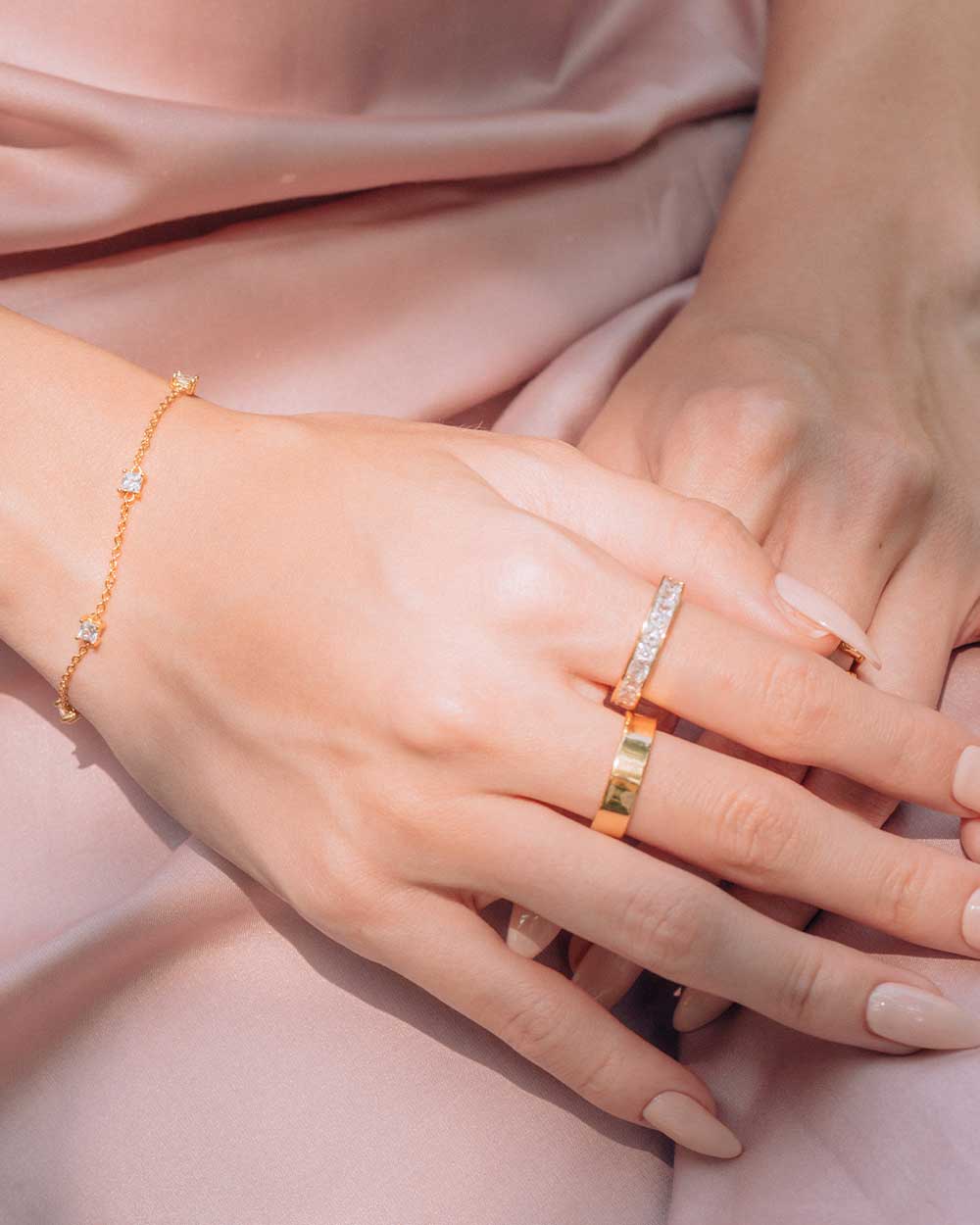 The Charlene Gold Ring’s band is adorned with a half band of glistening princess cut stones, producing a dazzling yet refined look. Both lively and sophisticated, this piece will perk up whatever ring stack or outfit you choose.