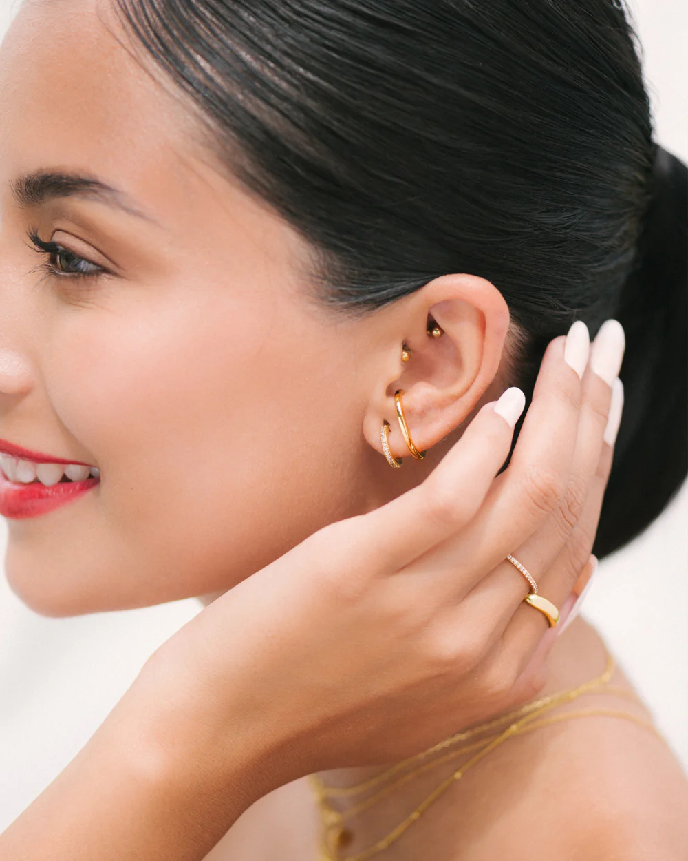 Want a multi-earring stack without having to get more piercings? A design like no other, this one-of-a-kind pair gives off the appearance of wearing both a sleek gold suspender and a huggie pavé-set with cubic zirconia. Take a single piercing to the next level with the Megan Gold Huggies.